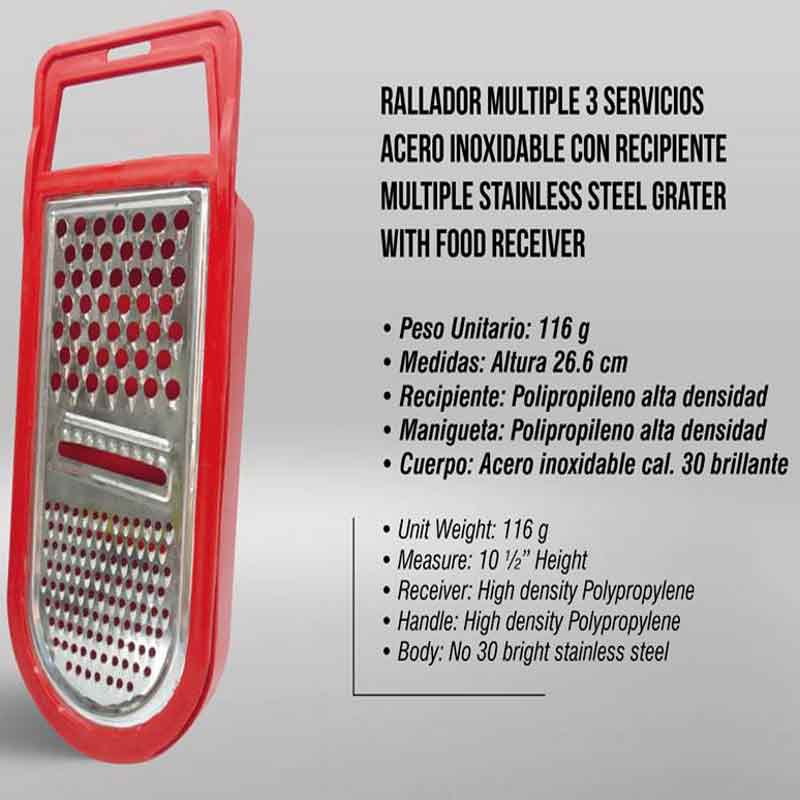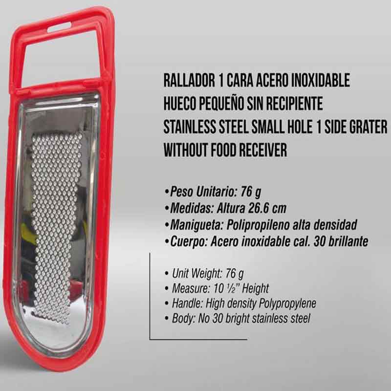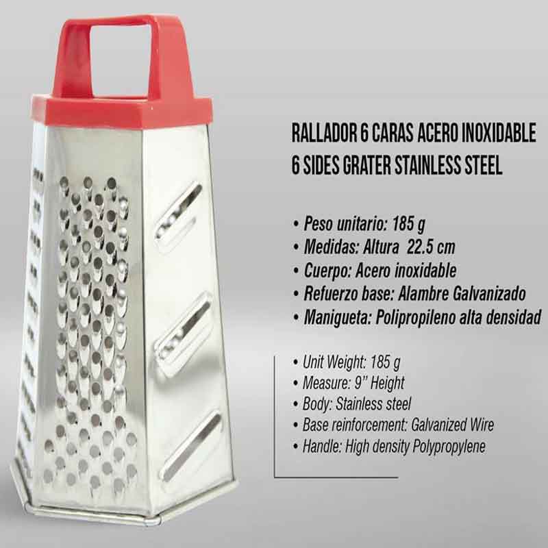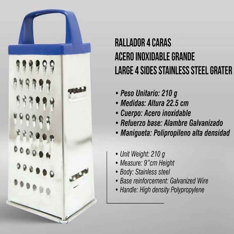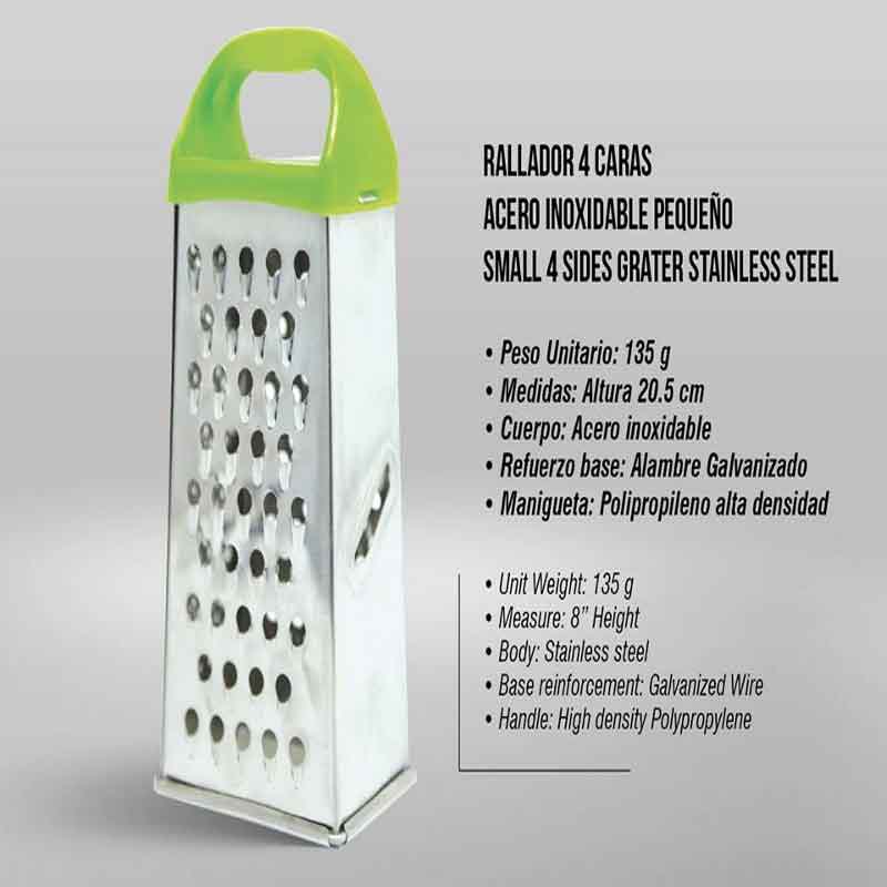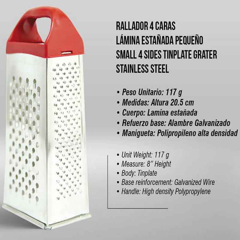 Los Ralladores los fabricamos en LaminaEstañada y AceroInoxidable. Vienen en tamaños de 6 - 4 y 1 caras. Los de 4 caras vienes grandes y pequeños y los de 1 cara vienen con y sin recipiente.